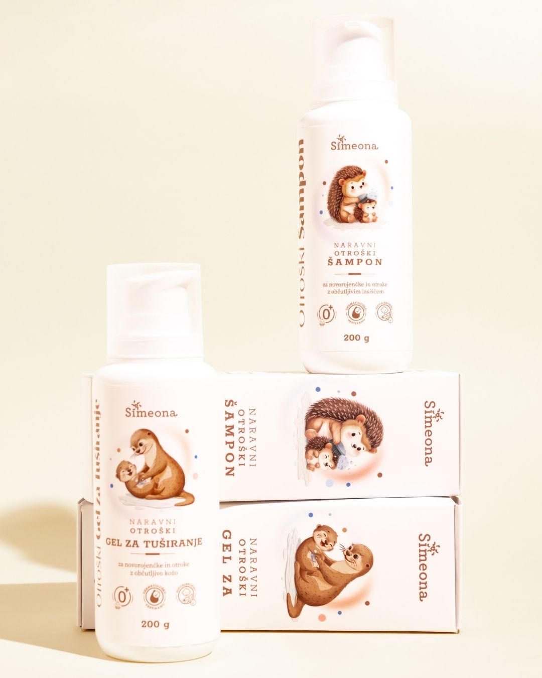Prav zato, sem ustvarili popoln komplet za vsakodnevno nego otrok, ki vsebuje samo naravne in nežne sestavine: Naravni otroški gel za tuširanje in naravni otroški šampon Simeona. Tako naravna in nežna, da sta primerna tudi za dojenčke, že od prvega umivanja dalje.